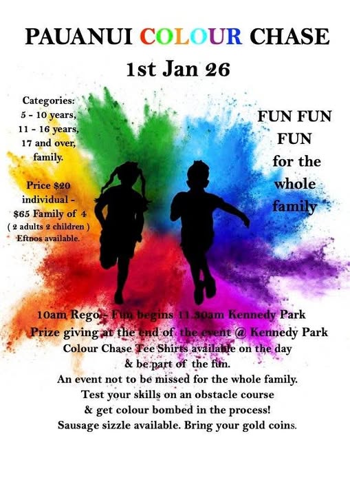 A fun event for the whole family. An event not to be missed for the whole family. Test your skills on an obstacle course & get colour bombed in the process! Sausage sizzle .