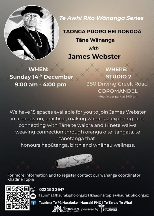 We are incredibly honoured to host James Webster, a world-renowned taonga pūoro artist, carver, activator, and cultural practitioner, for a very special Taonga Pūoro hei Rongoā – Tāne Wānanga.